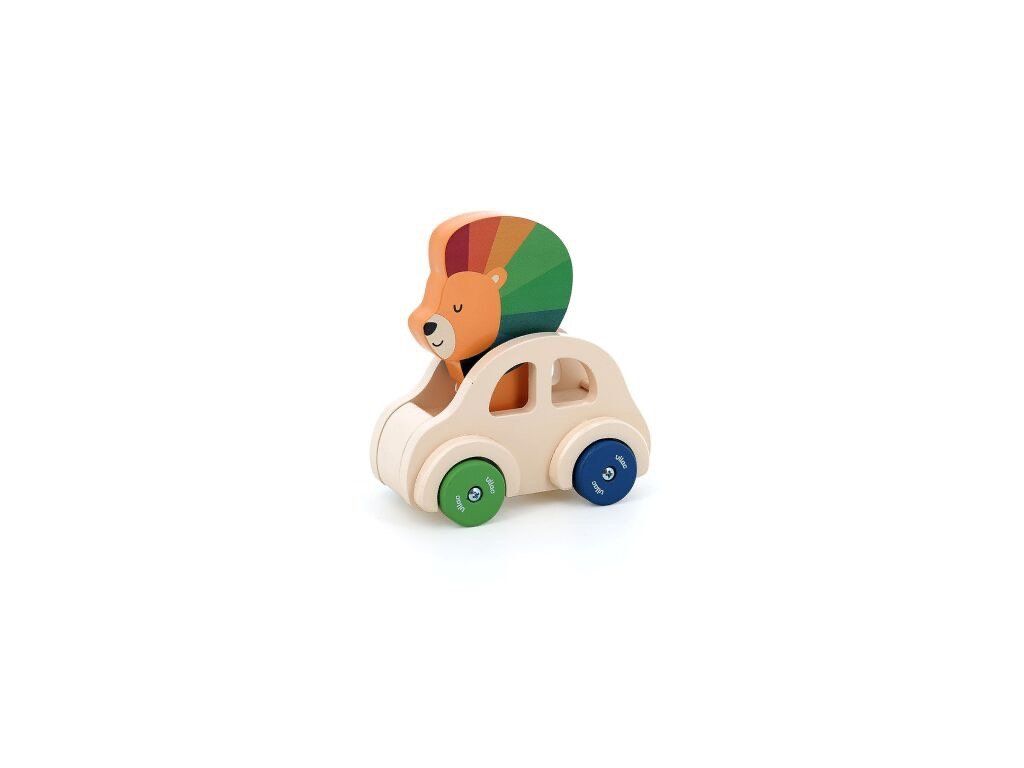 Roztomilé dřevěné autíčko v přírodní barvě s barevnými koly, ve kterém sedí veselý lvíček s barevnou hřívou, si děti okamžitě zamilují. Stačí zatlačit na jeho hlavu a ozve se klakson, který přidává hře zábavný zvukový prvek.