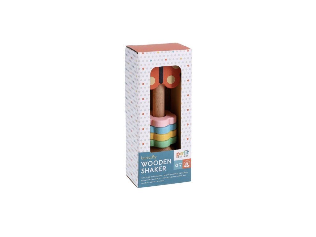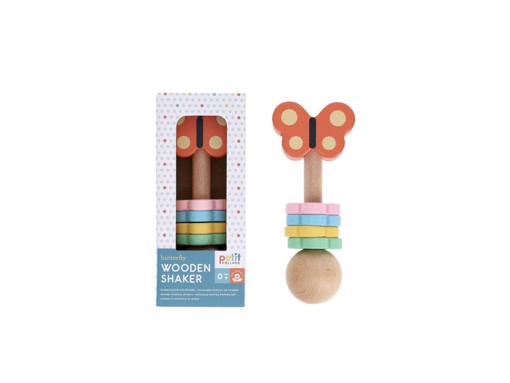 Dřevěné chrastítko Motýl od značky Petit Collage je hravou první hračkou pro nejmenší. „Třes, třes, třes!“ – při jemném pohybu vydává veselý zvuk, který přirozeně láká děti k objevování.
