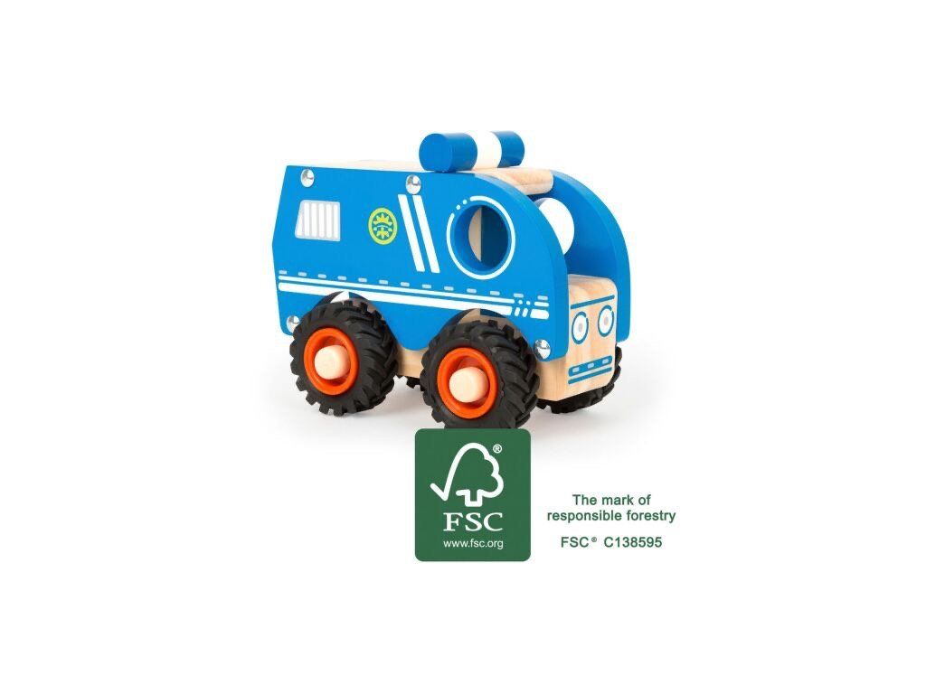 Kde se schovává zloděj? Toto kompaktní policejní auto ze 100% FSC® certifikovaného dřeva je připraveno vyrazit na každou misi. Díky robustním pogumovaným kolům snadno projede jakýmkoliv terénem a rychle dorazí na místo zásahu.