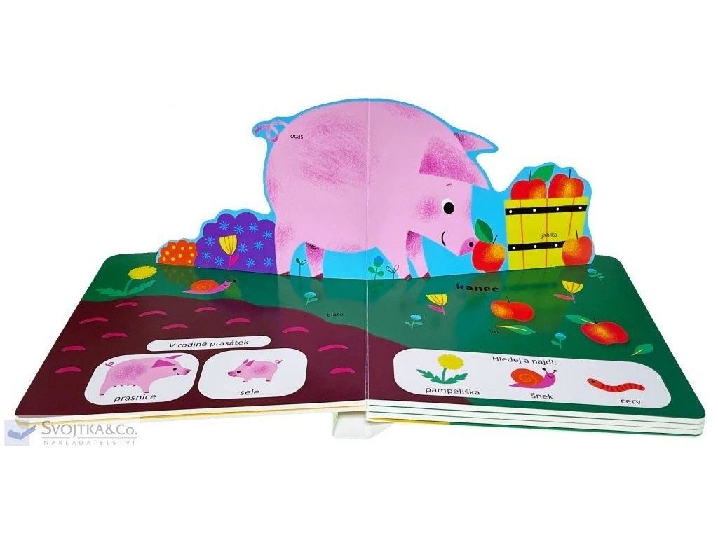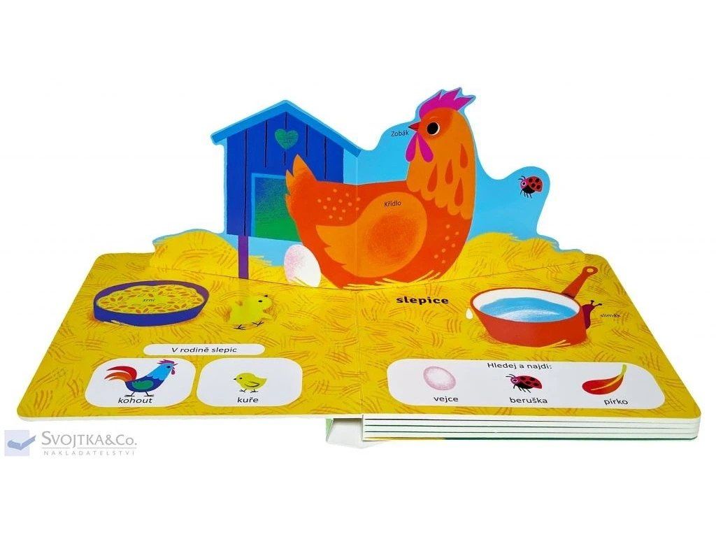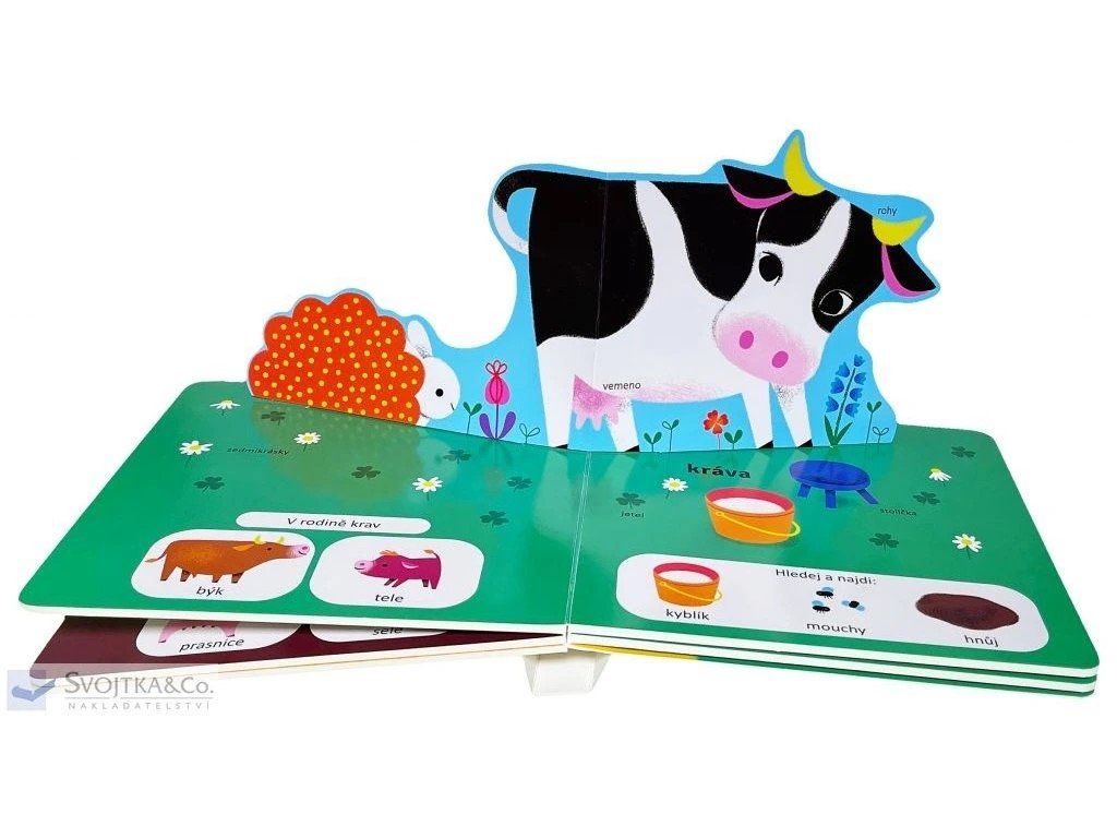 S každou otevřenou stránkou se z obrázku zvedne jedno hospodářské zvířátko, které děti zaujme a vtáhne do objevování života na farmě. Díky prostorovým prvkům mají děti pocit, jako by se ocitly přímo uprostřed farmy. Leporelo pomáhá dětem poznávat hospodářská zvířata, pojmenovávat jejich části těla a přiřazovat je do zvířecích rodin. Společné prohlížení knihy navíc nabízí spoustu příležitostí k povídání o farmě a zvířatech, která na ní žijí.
