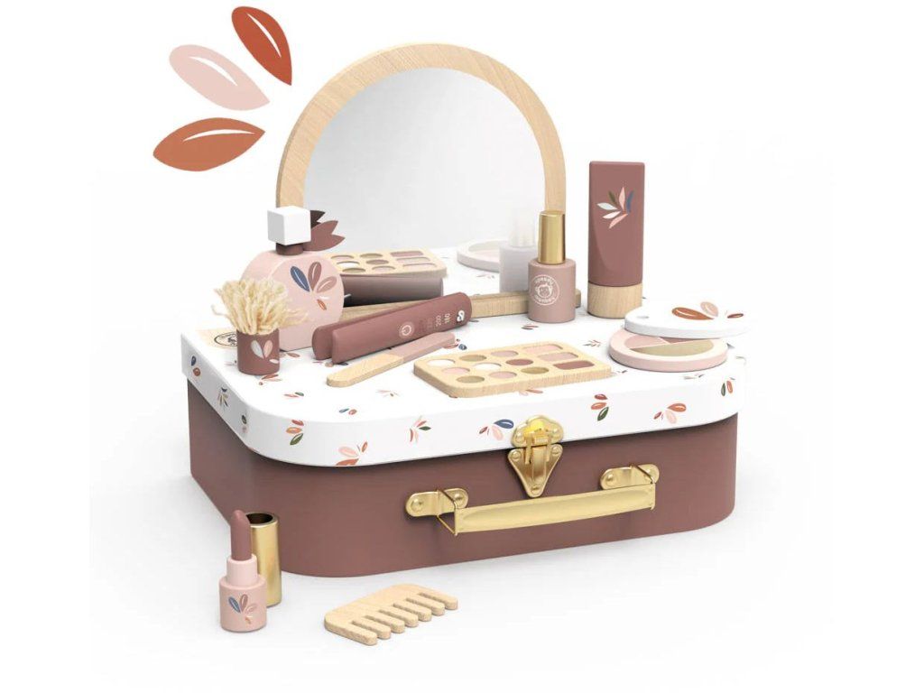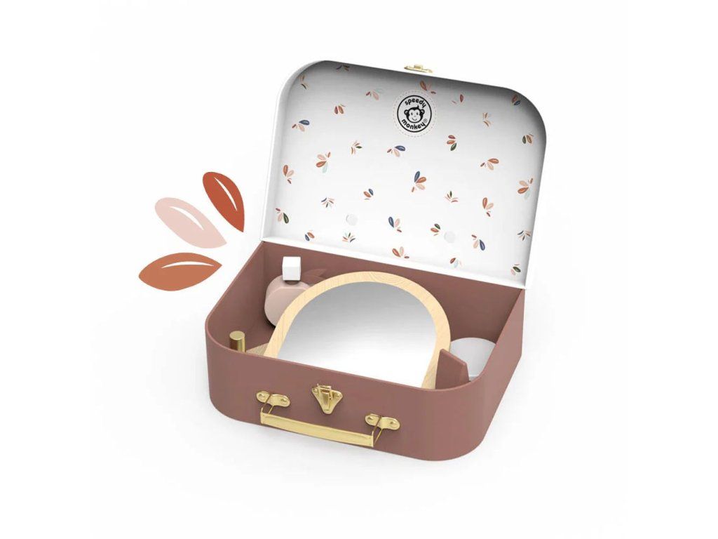 Po otevření kufříku objeví barevnou kolekci 12 dřevěných kosmetických doplňků navržených speciálně pro malé ručičky. Děti si mohou hrát na dospělé, napodobovat každodenní rutiny a užívat si kreativní hru bez obrazovek – od líčení až po péči o vlasy.