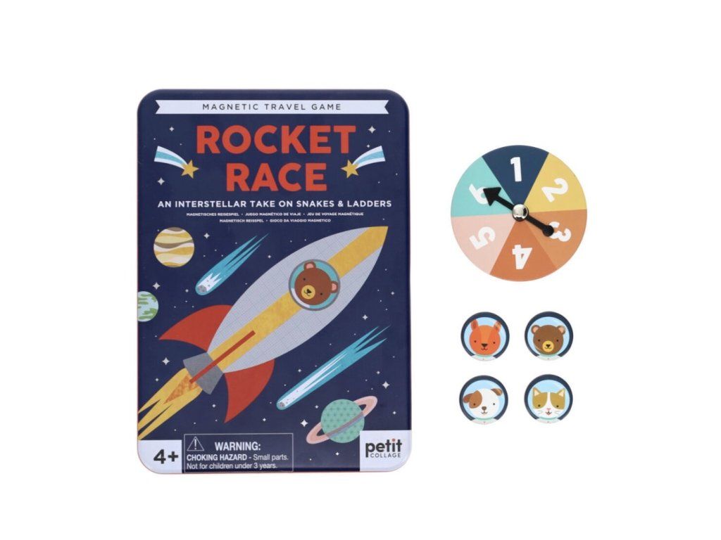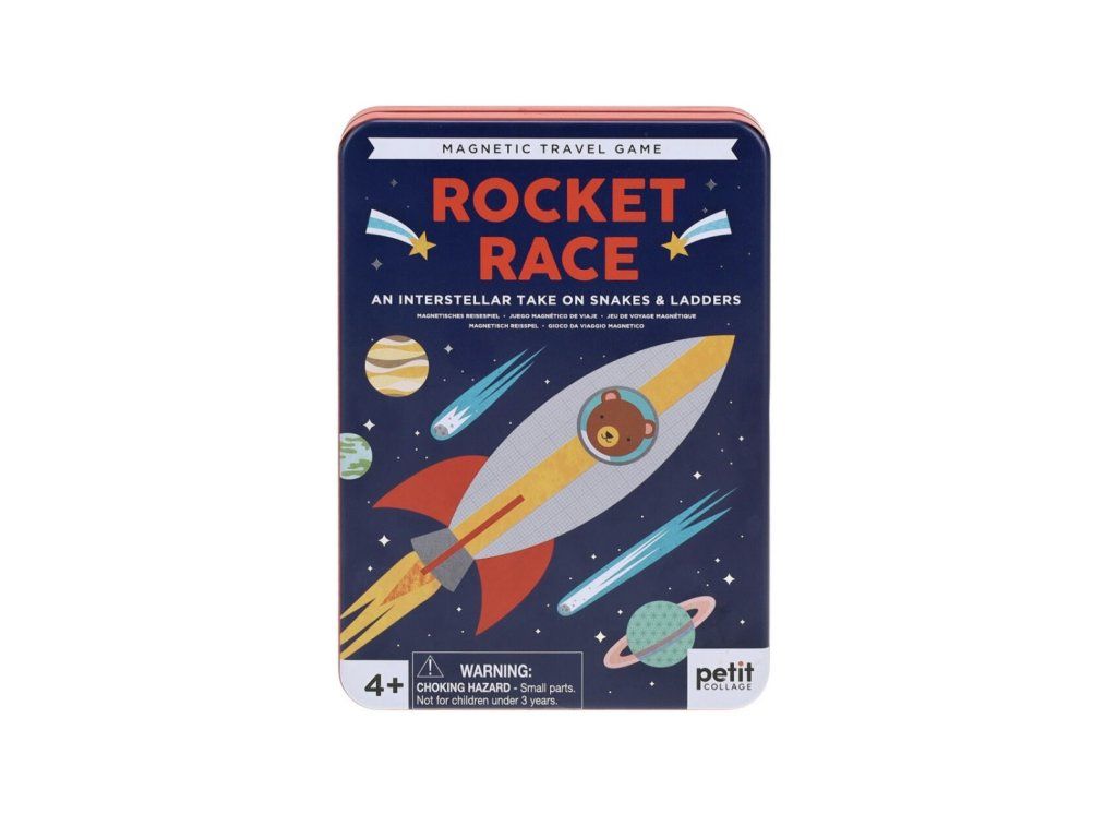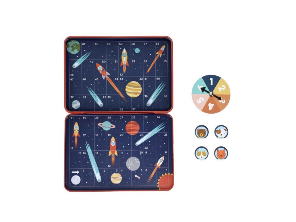 Odstartujte tento vesmírný závod s hravou deskovou hrou od značky Petit Collage. Tato zábavná hra v kovové krabičce je vesmírnou verzí klasických Hadů a žebříků a je plná veselých ilustrací. Hráči se střídají v otáčení kolečka s šipkou, která určuje, o kolik polí se posunou. Pokud se zastavíte na políčku s hořícím palivem rakety, vystoupáte vzhůru po jejím těle. Pozor ale na ohon komety – pokud na něj stoupnete, padáte zpět dolů na její jádro.
