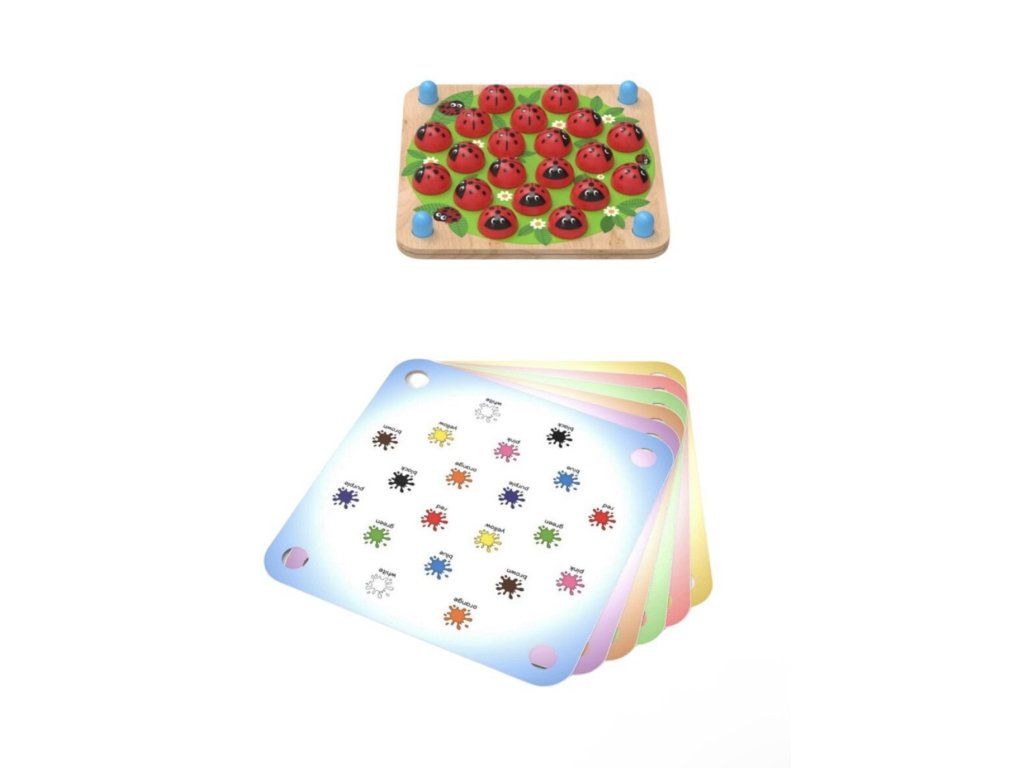 Stačí vložit jednu ze šesti tematických karet mezi dvě dřevěné desky, zakrýt obrázky beruškami a hra může začít. Děti si při hraní procvičí paměť, jemnou motoriku, logické myšlení a zároveň si rozšíří slovní zásobu. Hra je vhodná pro samostatné hraní i pro společné chvíle s rodinou.