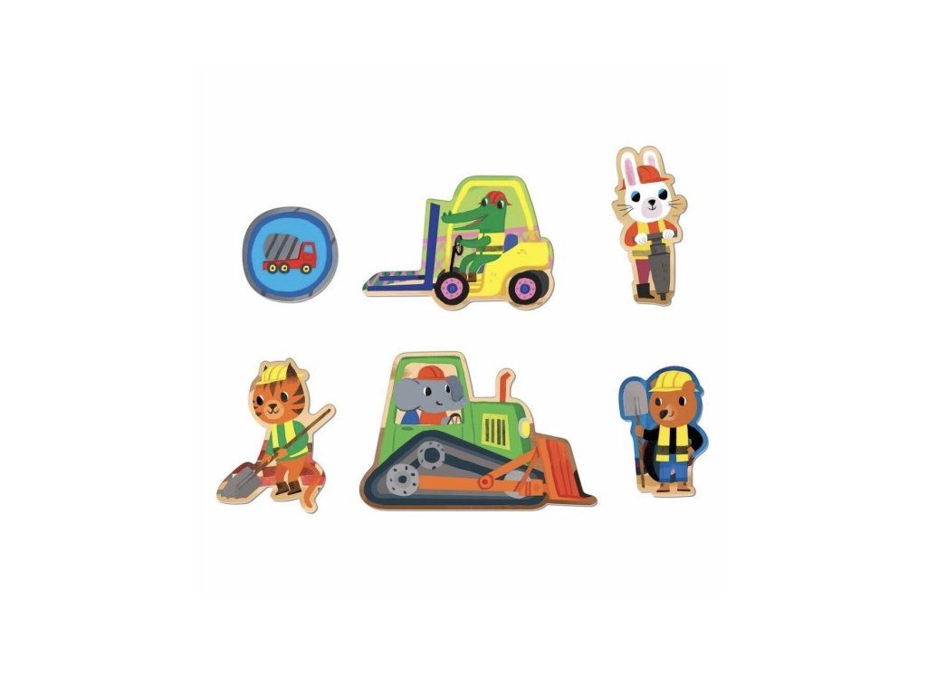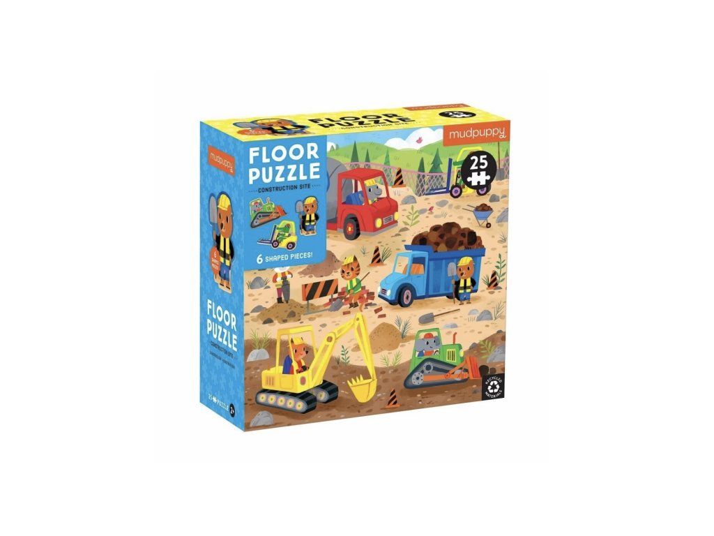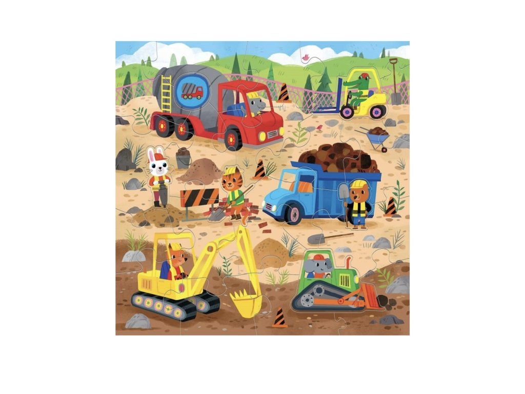 Velké stavební dobrodružství může začít! Toto podlahové puzzle s motivem stavebních vozidel a dělníků obsahuje 25 dílků, z toho 6 speciálně tvarovaných, které hru ještě více ozvláštní. Velké a pevné kousky jsou ideální pro malé dětské ruce a podporují rozvoj jemné motoriky, koordinace ruka–oko i trpělivosti.