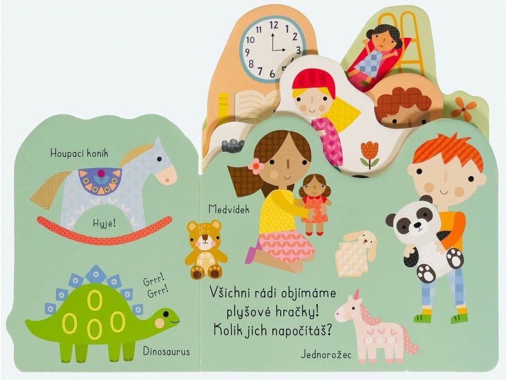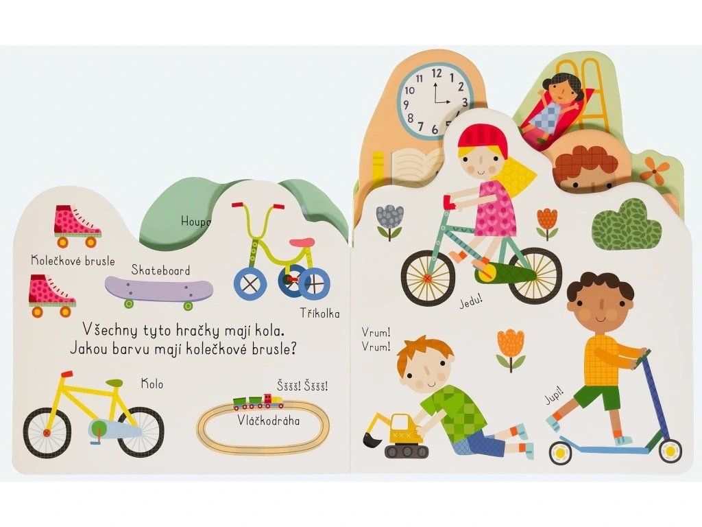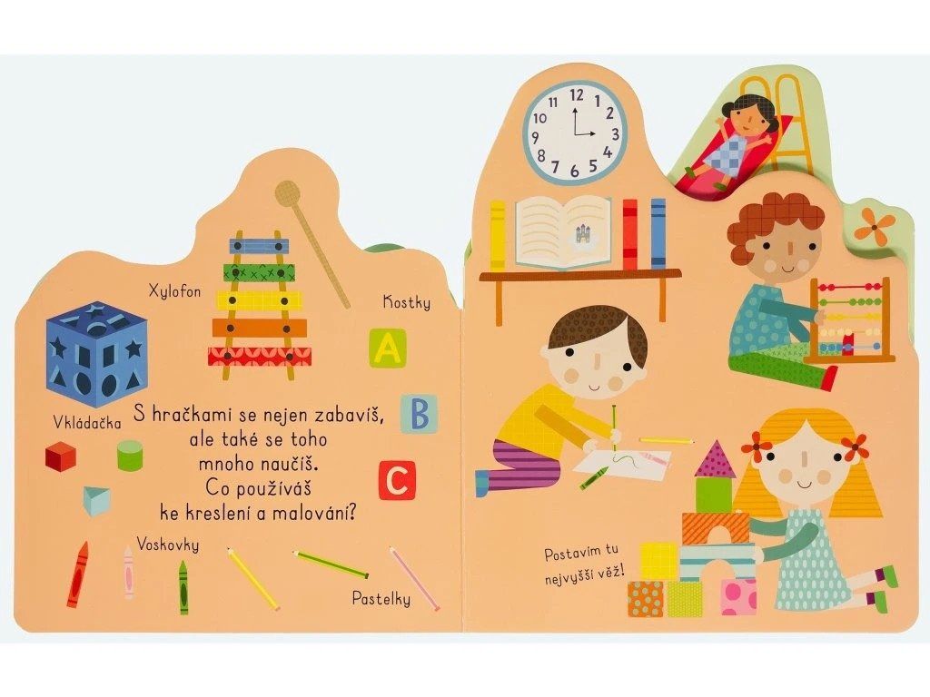 Kniha s milými ilustracemi obsahuje popisky hraček, obrázky každodenních aktivit a doplňující otázky. Díky nim si můžete s dítětem povídat o jeho oblíbených hračkách, kamarádech, denních činnostech nebo třeba o dnech ve školce.